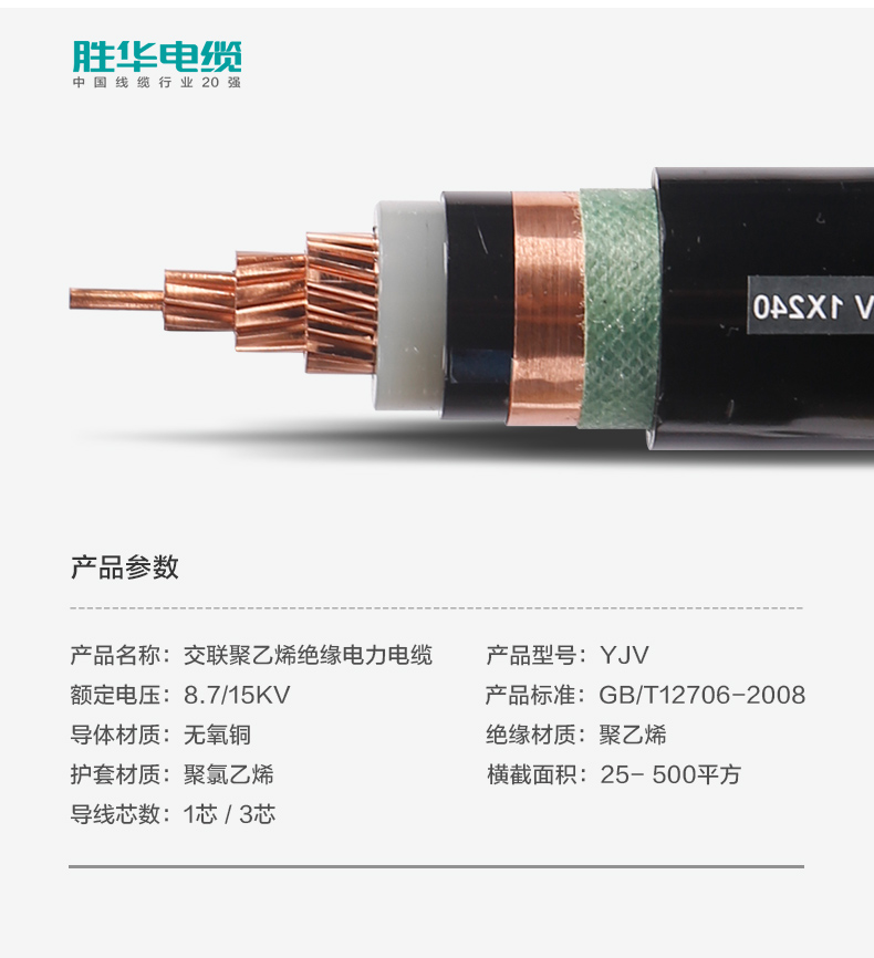 勝華電纜YJV-8.715KV中壓交聯聚氯乙烯絕緣銅芯電纜